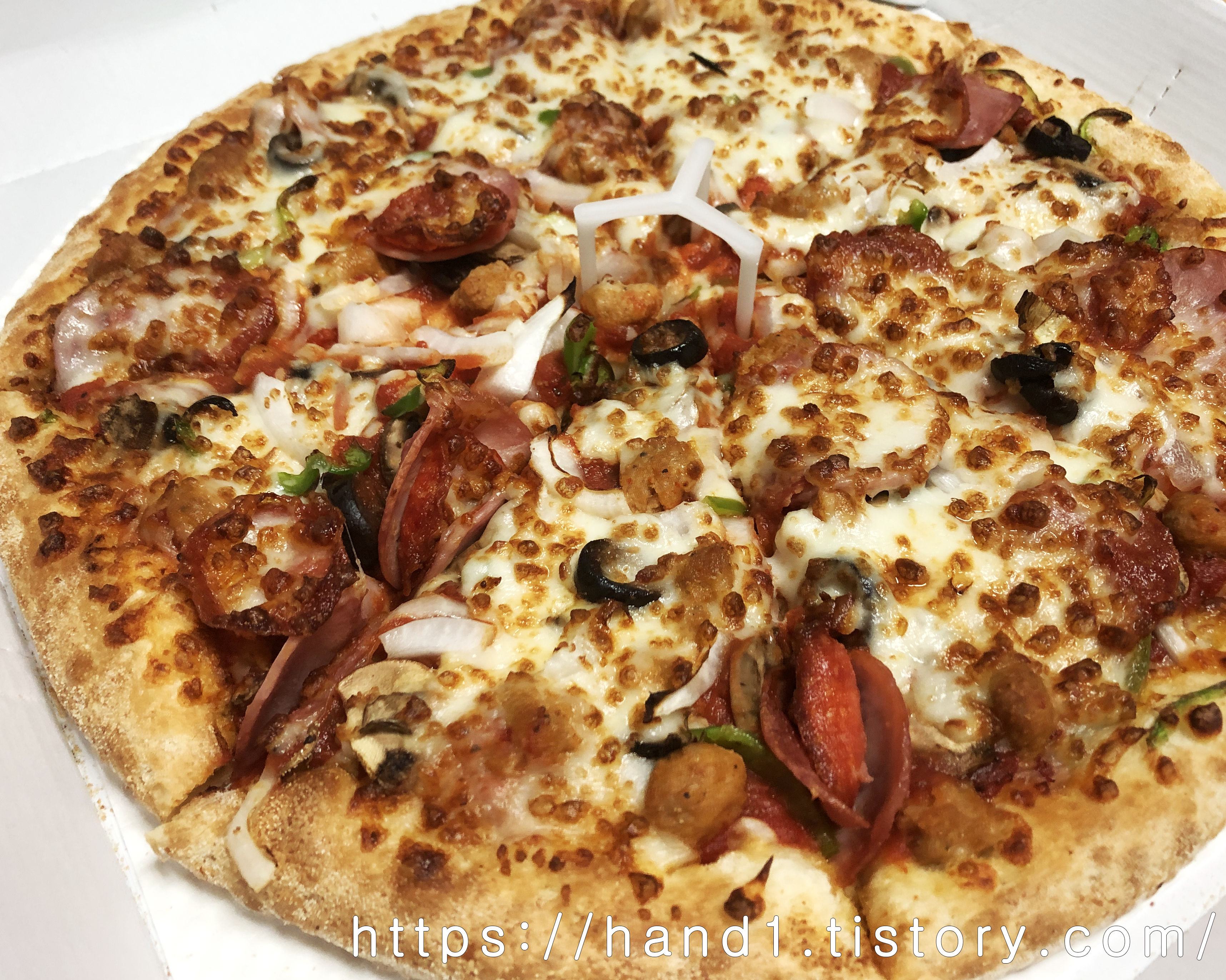 파파존스 수퍼 파파스는 치즈와 이탈리안 소시지, 양파, 피망, 양송이, 올리브, 페퍼로니등 다양하게 모두 들어있는 피자로 일반적인 콤비네이션 피자와 비슷하다고 보면 될듯합니다. 기본적인 재료들이지만 모두 푸짐하게 들어있어서 풍부한 식감과 맛을 느낄 수 있었습니다.
